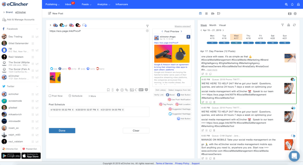 eClincher consente ad aziende e privati di tutte le dimensioni di programmare post social e articoli rilevanti su vari account social media.