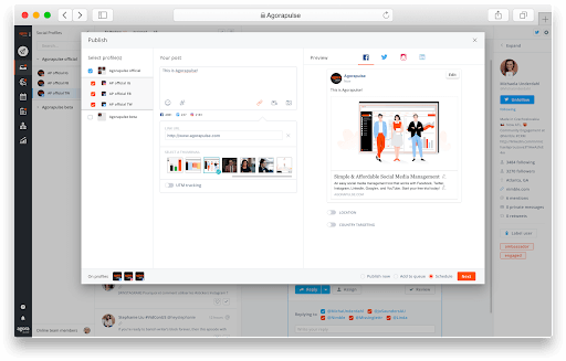 Agorapulse ti permette di postare simultaneamente su varie piattaforme social. Grazie a questo, puoi connetterti con potenziali partner commerciali e mantenere i contatti con il tuo database esistente tramite la comunicazione social.