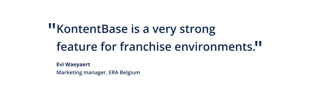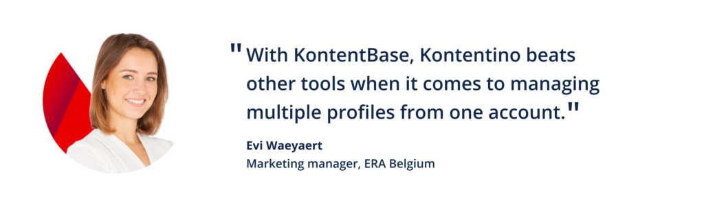 Kuna paljudel ERA Belgiumi esindustel on oma sotsiaalmeedia profiilid, loob peakontori turundusjuht Evi Waeyaert globaalset sisu, mida saavad kohandada ka üksikud agendid. Selleks kasutab ta Kontentino unikaalset funktsiooni nimega KontentBase. See funktsioon loodi globaalse sotsiaalmeedia sisu planeerimise ja levitamise haldamiseks kohalikele harudele ja kontoritele. Evi puhul lihtsustab KontentBase aga töövoogu kohalikul tasandil – ta saab luua, planeerida ja ajastada sisu ühes rakenduses ning pakkuda agentidele originaalseid sisuideid ja allikaid.