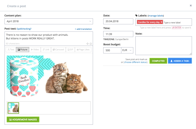 Tehtud! Postitus on kopeeritud koos teksti (caption), kuupäeva, kellaaja ja eelarvega. Nüüd korda sama protsessi teiste kanalitega.