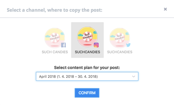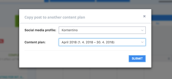 Vali profiil ja content plan, kuhu soovid kopeerida. Näiteks valime Kontentino LinkedIni aprillikuu plaani.