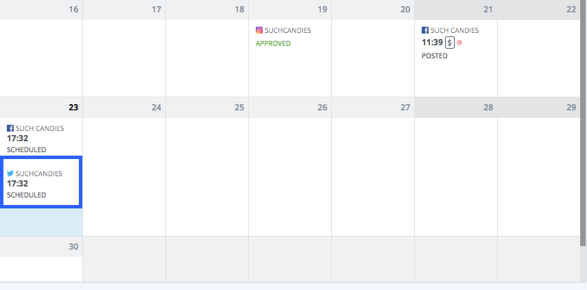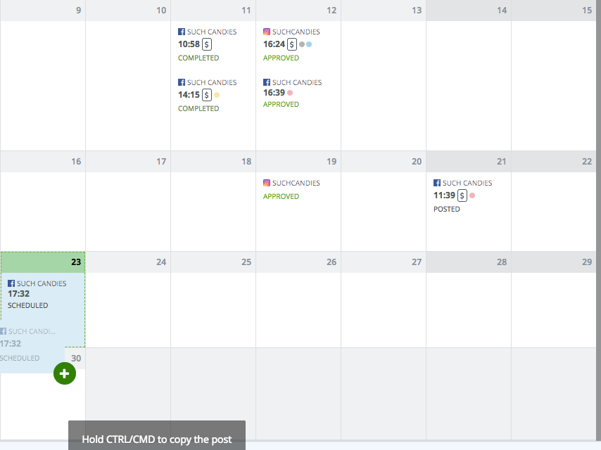 Kalendrivaates lohista (drag) loodud postitus, hoides all Ctrl/Cmd klahvi, ning aseta see päeva aknasse, kuhu soovid seda kopeerida.