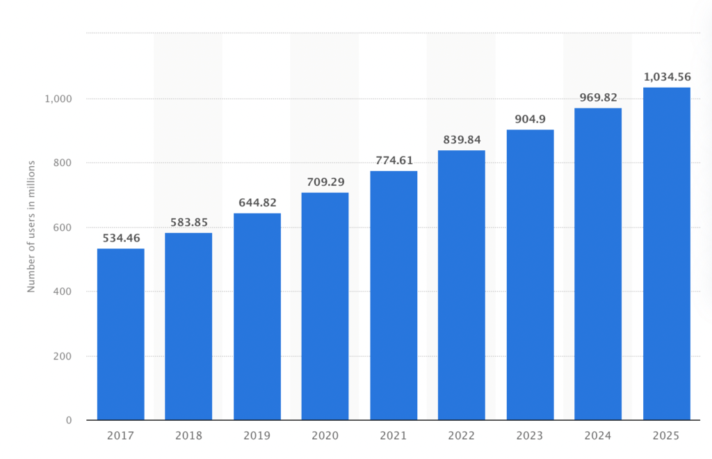 Até 2025, espera-se que atinja mil milhões de utilizadores, de acordo com a Statista.