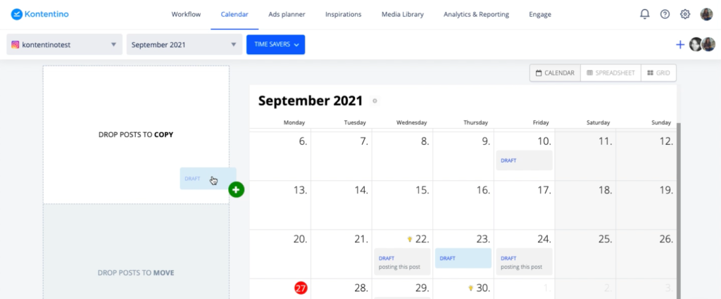 Grid view este o vizualizare specială a calendarului, dedicată Instagram. Îți permite să vezi cum va arăta feed-ul tău imediat ce postările sunt publicate. Astfel, te asiguri că ai un grid bine organizat vizual. În plus, poți schimba data și ora postărilor prin drag-and-drop direct în grid.