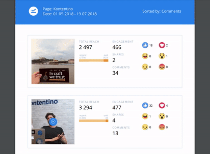 Kampaň běží, co teď? Nejlepší praxí je samozřejmě ji čas od času zkontrolovat. Také je dobré sledovat nejúspěšnější posty. Tehdy se hodí seřadit si je podle konkrétní metriky. Získáte tak okamžitý přehled a pomůže vám to k rychlému rozhodování – vede si některý post výjimečně dobře? Pak je dobrý nápad to využít a zvýšit jeho budget na boost. A naopak, pokud post zaostává, může být rozumné boost vypnout. Posty takto snadno seřadíte v Kontentino Insights & Reporting.
