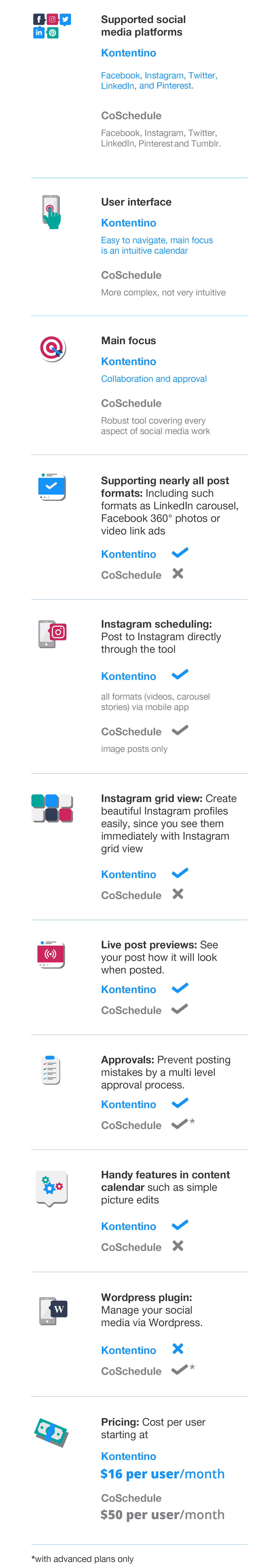 Podczas gdy w Kontentino otrzymujesz niemal wszystkie funkcje w każdym planie, w przypadku CoSchedule musisz decydować, z czego chcesz korzystać, i na tej podstawie wybrać odpowiedni pakiet.