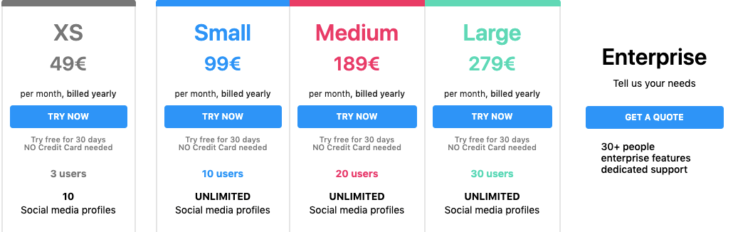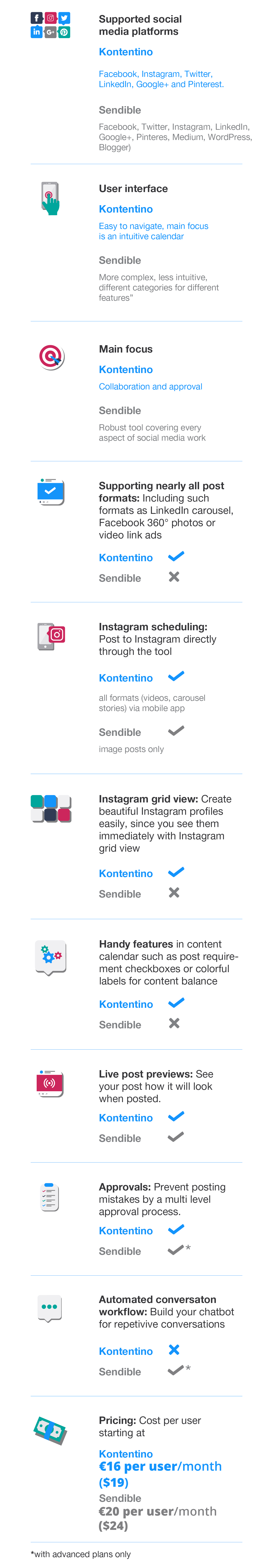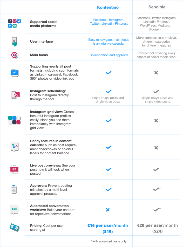 Różnica tkwi również w cenie. Podczas gdy ceny Kontentino zaczynają się od 16 €/miesiąc/użytkownik, w przypadku Sendible jest to 20 €/miesiąc/użytkownik (24 $).