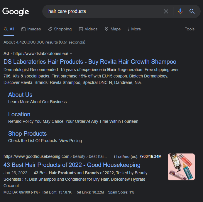 Choďte na Google a vyhľadajte kľúčové slová spojené s vaším odvetvím, napr. „vlasová kozmetika“.