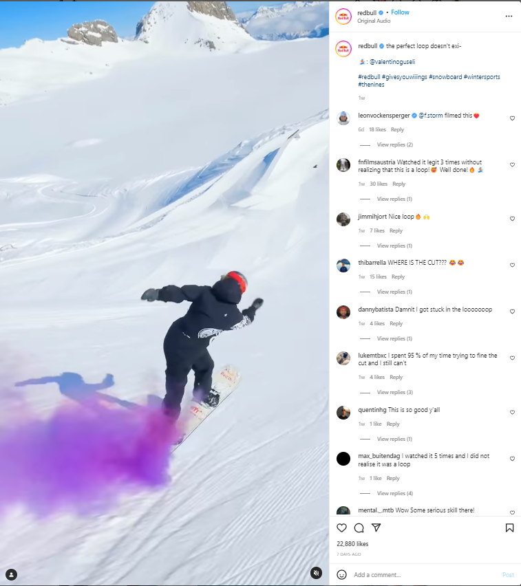 Zatiaľ čo používatelia v príspevkoch na ich feede testujú svoje fyzické limity, v pozadí je vždy prítomné logo Red Bull. Zanecháva to jasný dojem: Red Bull vám dáva krídla.