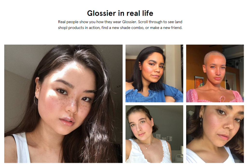 Značka Glossier posúva UGC ešte ďalej. Má celú webovú stránku venovanú obsahu od zákazníkov. Každá fotka obsahuje priamy odkaz na príspevok pôvodného tvorcu a povzbudzuje návštevníkov, aby „videli produkty v akcii, našli nový odtieň alebo spoznali nových priateľov“.