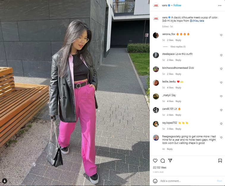 Slogan a filozofia „Off The Wall“ značky Vans sú orientované na ľudí. Keby sa Vans len chválili svojimi produktmi, stratili by kontakt s cieľovkou. Namiesto toho využívajú sociálne siete ako priestor, kde ich zákazníci zdieľajú svoje outfity a to, ako svoje Vansky nosia.